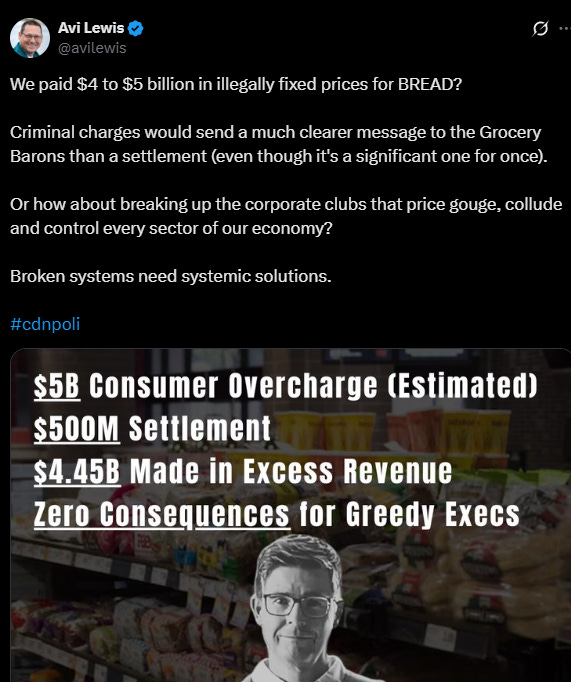 This is where Avi Lewis—likely set to run for the NDP leadership—is stepping in. Commenting on the long-running bread price fixing scandal in Canada, Lewis made it clear that mere fines will never actually solve the issue, because they amount to pocket change when it comes to the billionaire class: